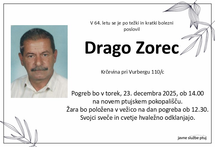 Pogreb bo v torek, 23. decembra 2025, ob 14.00 na novem ptujskem pokopališču.