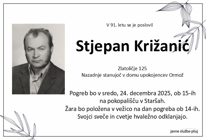 Pogreb bo v sredo, 24. decembra 2025, ob 15-ih na pokopališču v Staršah.